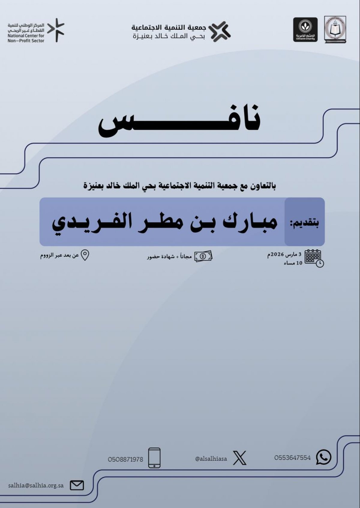 الجمعية الأهلية الصالحية في عنيزة ترحب بكم في برنامج نافس التي تنظمه بالتعاون مع جمعية التنمية الاجتماعية بحي الملك خالد في عنيزة مجانًا+ شهادة حضور عن بعد عبر الزووم الساعة العاشرة مساء يوم الثلاثاء 3/ 3/ 2026م، الموافق 14/ 9/ 1447هـ
