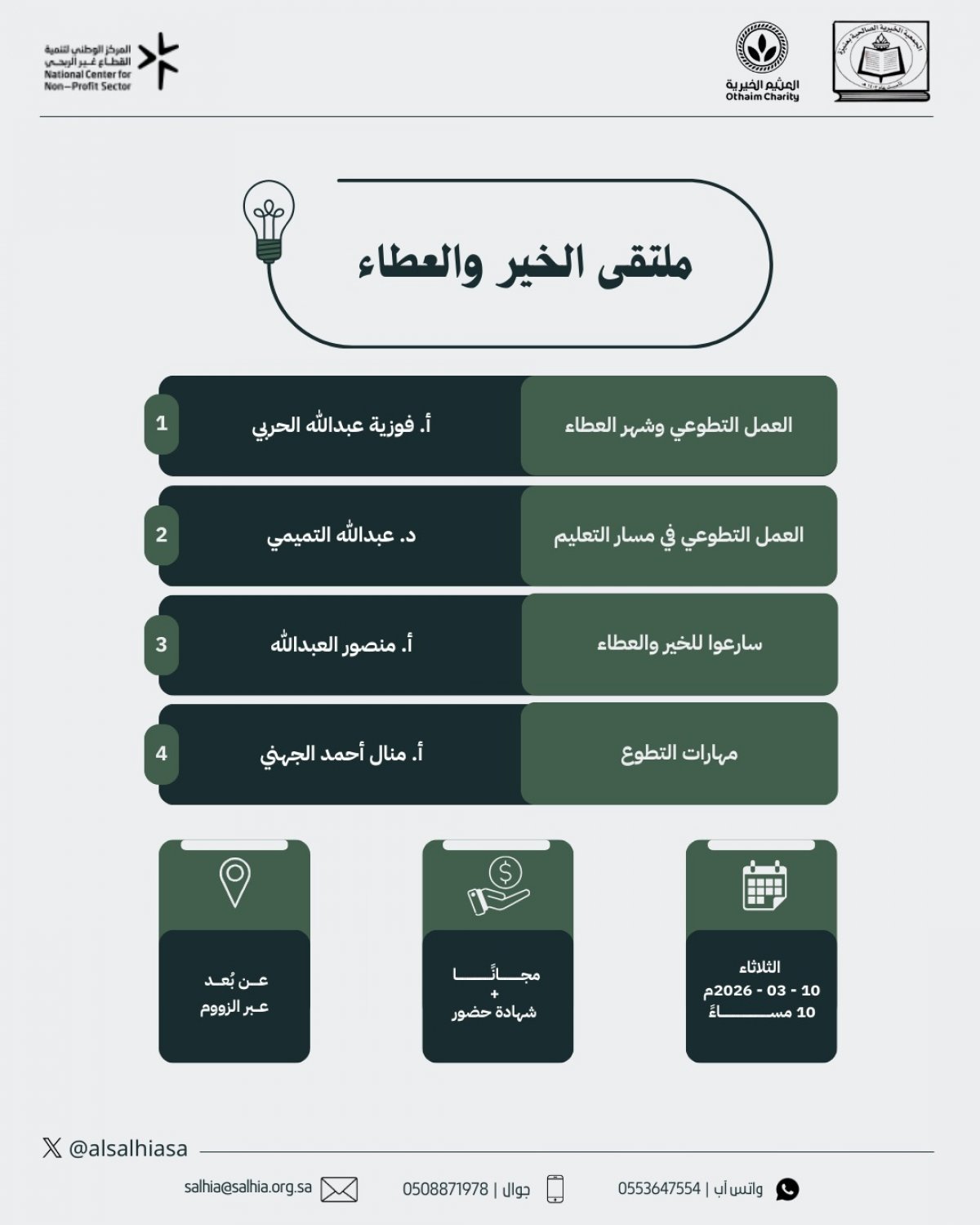الجمعية الأهلية الصالحية في عنيزة ترحب بكم في ملتقى الخير والعطاء الساعة العاشرة مساء الثلاثاء ٢١/ ٩/ ١٤٤٧هـ