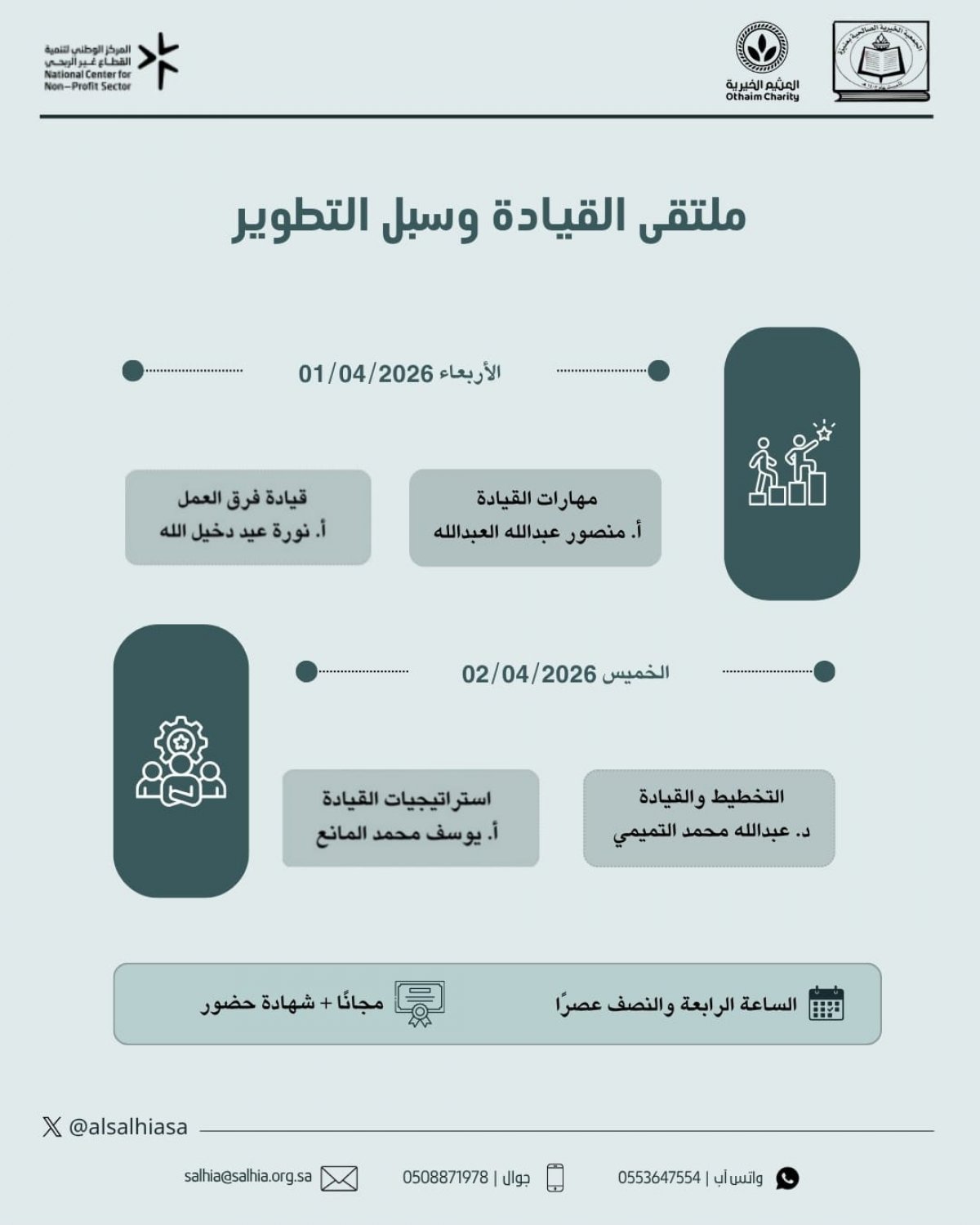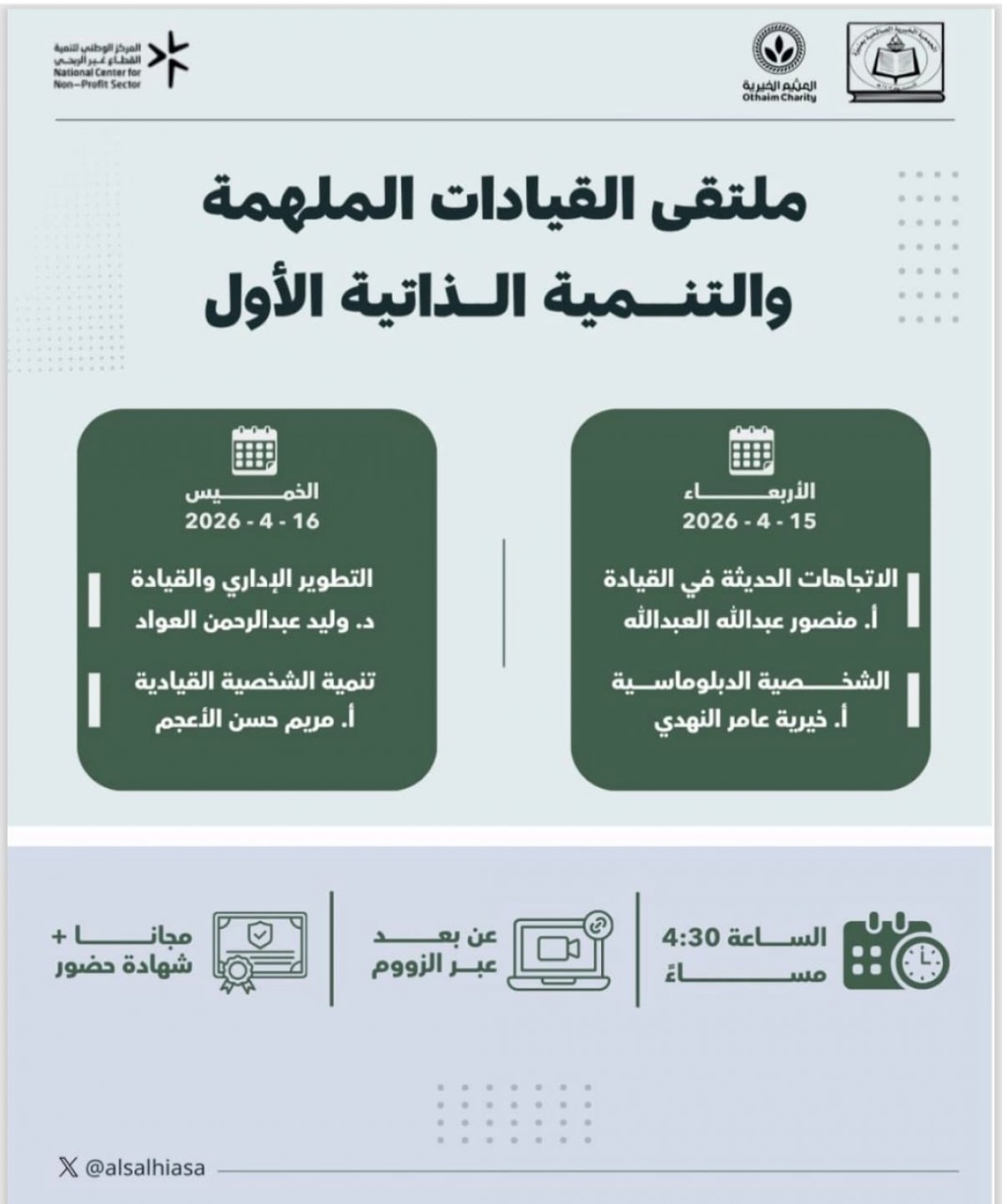 الجمعية الأهلية الصالحية في عنيزة ترحب بكم في ملتقى القيادات الملهمة والتنمية الذاتية الأول الأربعاء 15/ 4/ 2026م