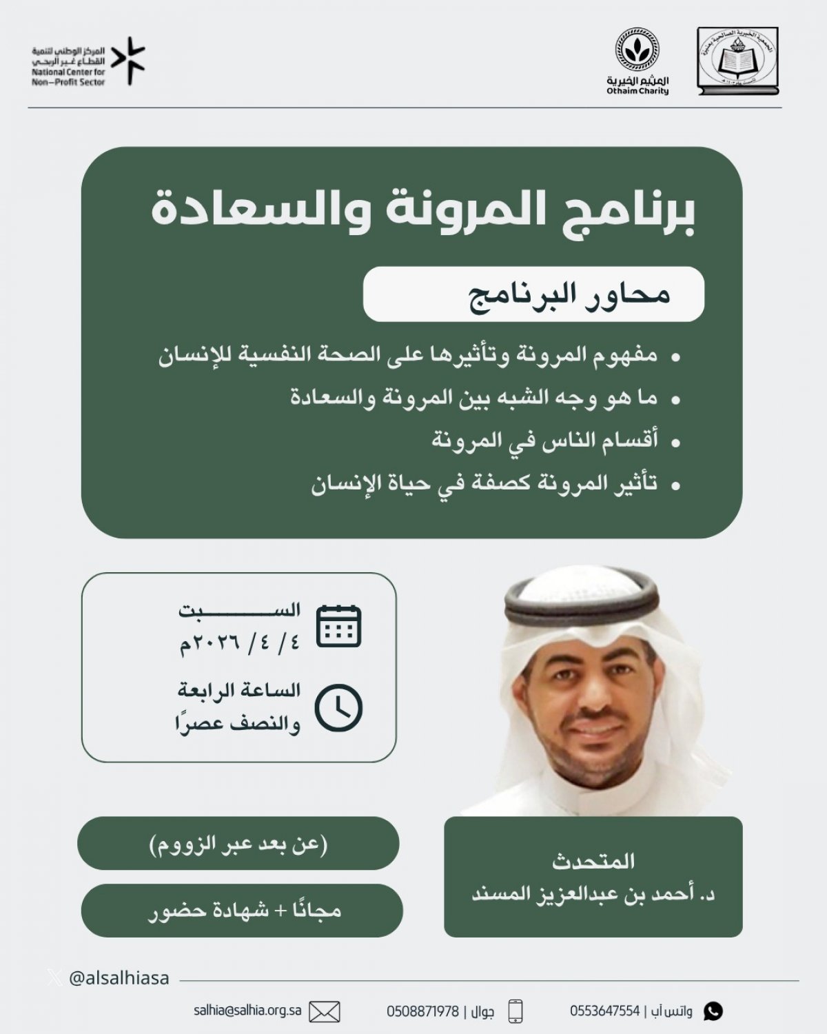 يسر الجمعية الأهلية الصالحية في عنيزة دعوتكم لحضور برنامج المرونة والسعادة