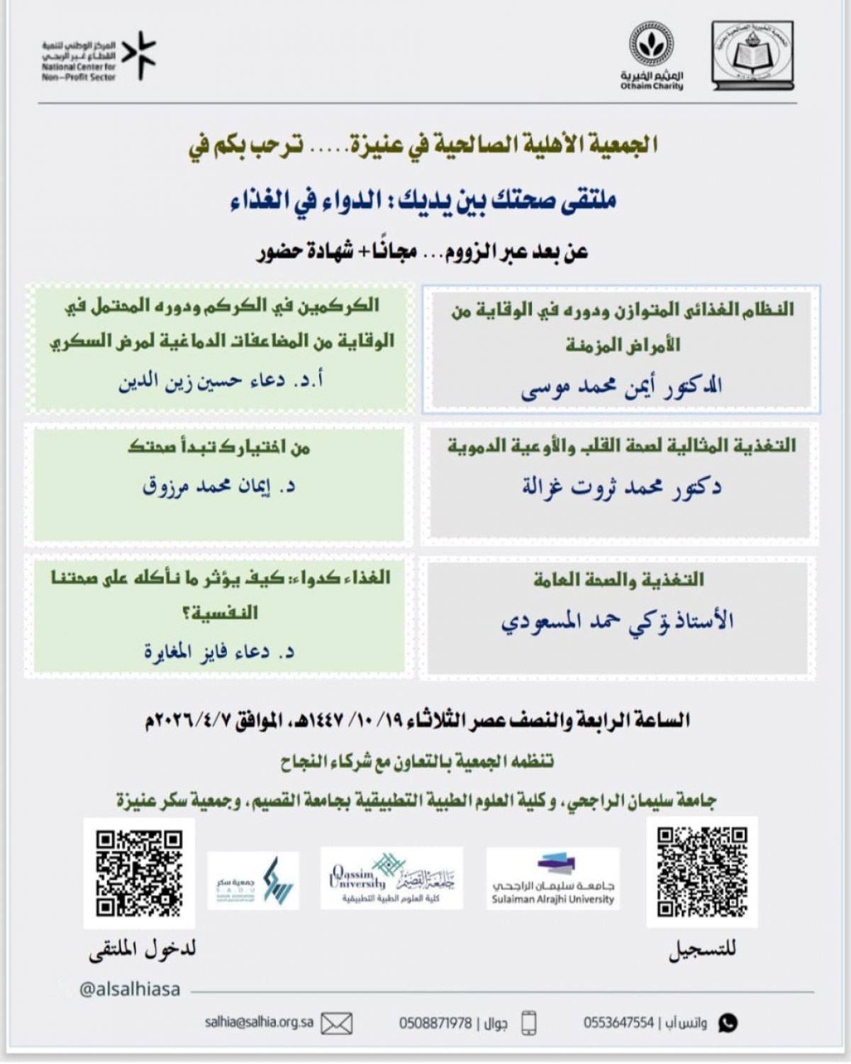 يسر الجمعية الأهلية الصالحية في عنيزة دعوتكم لحضور ملتقى صحتك بين يديك: الدواء في الغذاء عن بعد عبر تطبيق الزووم مجانًا + شهادة حضور تنظمه الجمعية بالتعاون مع جامعة سليمان الراجحي، وكلية العلوم الطبية التطبيقية وجمعية سكر عنيزة